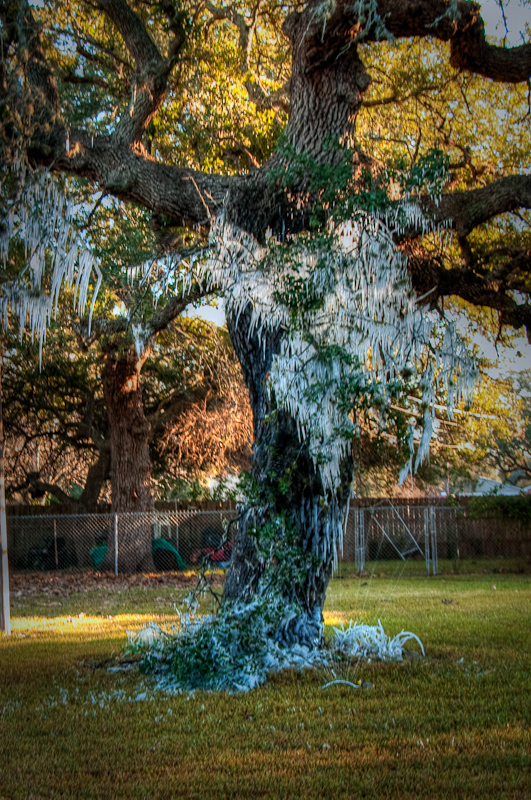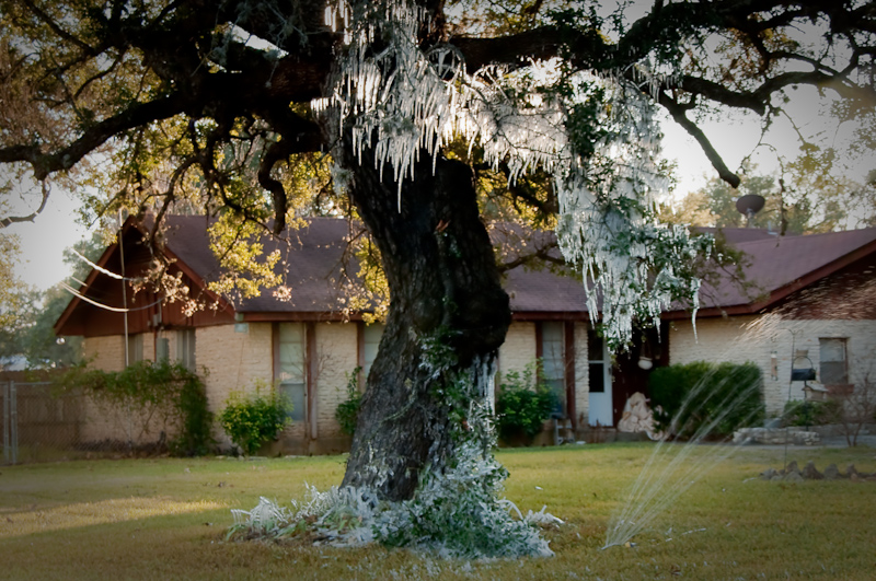 Seems someone forgot to turn the sprinkler off. But then again, it was under 40 degrees outside and wasn’t sure why the folks were waterin’? With the wind blowin’ and all it froze in the tree making for an interesting sight.